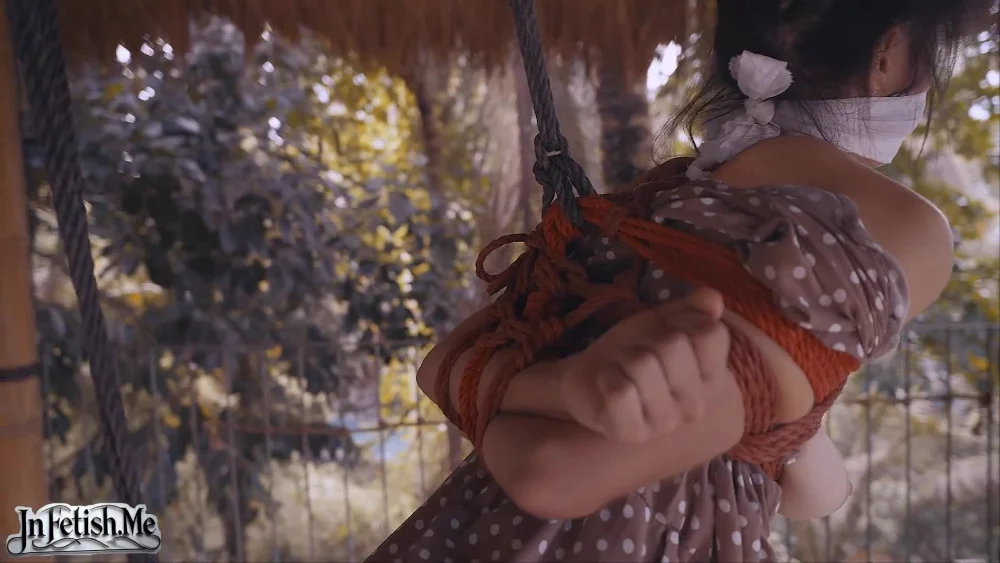 Finally found a place where can practice shibari! We climbed onto the roof of some old barn right behind our house. We don’t know at all whose it is, but we decided to use it. The place is not very private. Every time we are very afraid that someone will come and hear or see what we are doing. Someone is constantly walking under us, and the rustling of the bushes makes us tense. I did not take off Sangini`s dress so that, if anything happened, we could pretend that doing nothing unusual. Our fun is becoming truly dangerous. I play with Sangini's naked pussy tightening the rope between her legs in a suspension and on the floor, and she moans loudly and squirms in my ropes. Next time I plan to fuck her right there for you to see.